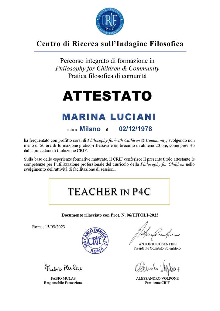 Dopo anni di studio e mesi di tirocinio, affiancati da una pratica costante, Marina è finalmente Teacher di P4C – Philosophy for Children & Community certificata da CRIF – Centro Ricerca sull’ Indagine Filosofica